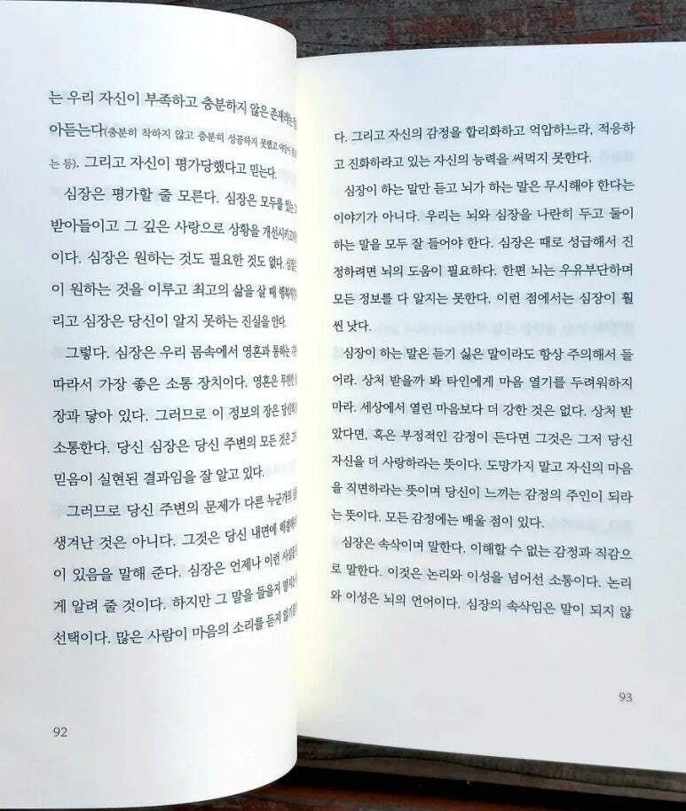 "심장이 보내는 신호를 계속 무시하면 끝내 건강이 나빠질 수도 있다. 심장의 말과 감정을 무시하는 것은 인생에 스트레스를 더하고 결국 스스로를 무너지게 만들 뿐이다. 꼭 아프지 않더라도 불안감이 스멀스멀 올라올 수도 있고 신경이 과민해질 수도 있다. 이것은 단지 심장이 좀 극단 적인 방식으로 당신과의 소통을 시도하기 때문이다. 심장은 당신이 깨어나 정말로 원하는 일을 하기를 바라기 때문이다."