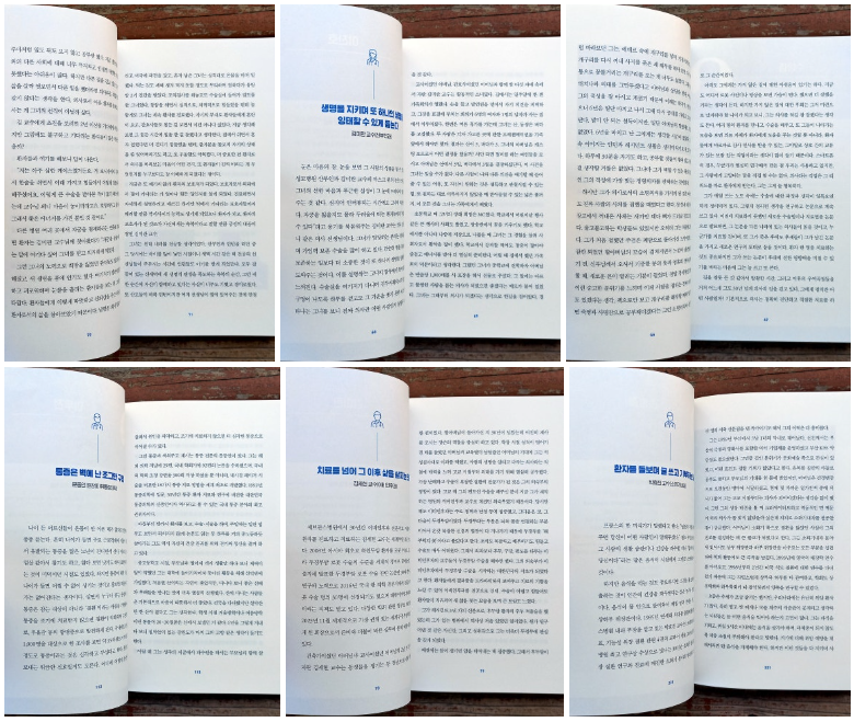 책을 읽다 보면 평소에 환자를 치료하기 위해서 어떤 마음으로 봉사를 하며 사명감있게 일을 하는지를 자신의 경험담을 들려주는 인터뷰 내용이 담겨진 걸 볼 수 있다. 절체절명의 순간에도 사람을 살리기 위해 어떤 행동을 하면서 사람을 살렸는지를 자신의 성공담까지 볼 수 있어서 의사로서 자질에 대해 다시한번 고뇌해보게 된다.