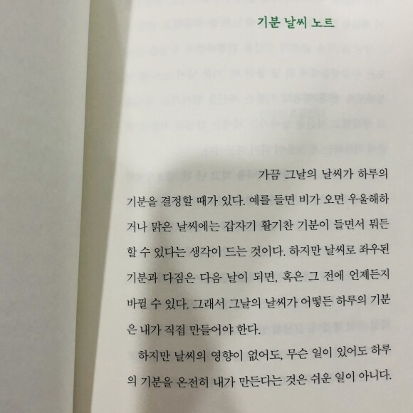 가끔 그날의 날씨가 하루의 기분을 결정할 때가 있다. 예를 들면 비가 오면 우울해하거나 맑은 날씨에는 갑자기 활기찬 기분이 들면서 뭐든 할 수 있다는 생각이 드는 것이다. 하지만 날씨로 좌우된 기분과 다짐은 다음 날이 되면, 혹은 그 전에 언제든지 바뀔 수 있다. 그래서 그날의 날씨가 어떻든 하루의 기분은 내가 직접 만들어야 한다.