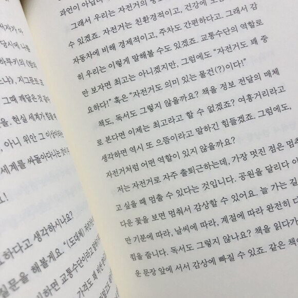 독서의 중요성을 묻는 질문에 답한 부분이다. 독서가 왜 중요하냐는 질문에 다들 '문해력' 이나 '지식 습득'을 답하는데 이 책에서는 자전거처럼 온전하고 객관적인 목적이 존재하는 것이 아니라 주관적이고 어떤 역할이 존재한다고 해석한 것이 흥미로웠다. 내 생각과도 비슷하게 다가왔기에 이 부분부터 더 몰입해서 읽게 되었다.