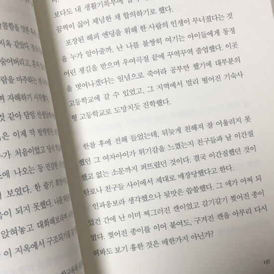 인과응보라 생각했으나 뒷맛은 씁쓸했다. 그 애가 어찌 되었건 간에 난 이미 찌그러진 캔이었고 갈기갈기 찢어진 종이였다. 찢어진 종이를 이어 붙여도, 구겨진 캔을 아무리 다시 펴봐도 보기 흉한 것은 매한가지 아닌가? - P137