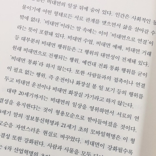 인간은 사회적인 동물이기에 어떤 형태로든 서로 관계를 맺으면서 삶을 살아갈 수밖에 없다. ‘비대면‘이라는 말 속에는 이미 ‘비대면으로 연결‘이라는 뜻이 포함돼 있다. - P248