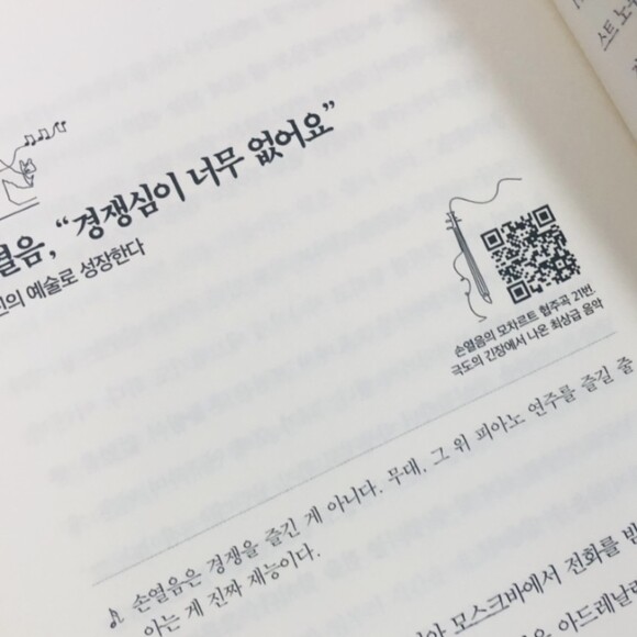 우선 가장 좋았던 점은 아래 사진처럼 매 주제마다 해당 부분에서 이야기하는 음악과 관련이 있는 영상이 담긴 QR코드를 넣었다는 점이다. 해당 부분을 읽으며 QP코드를 통해 연결된 유튜브 영상을 들어 클래식을 더 즐겁고 깊이 있게 감상할 수 있었다. 한 챕터를 읽기 전이나 읽은 뒤 영상으로 보는 것도 좋다. 연주 영상은 특히 연주하는 연주자의 모습과 행동 하나하나에도 매료되기 때문에 오히려 영상으로 보는 것이 더 좋을 때가 많기도 하다.