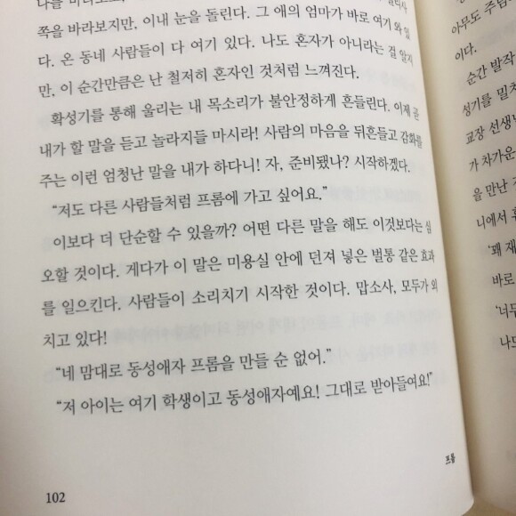 이야기의 소재상 어쩔 수 없이 불편한 내용이 있을지도 모른다. 하지만 그건 사회상의 오래된, 낡고 모순된 규정에 익숙해져서 그런 것은 아닐까? 우리는 이 책의 대다수처럼 사회의 고정관념에 사로잡혀 세상을 보다 넓게 바라볼 준비가 되지 않은 것일지도 모른다. 이전에 읽은 '종말주의자 고희망'이나 '오, 사랑'처럼 성소수자를 다루는 도서도 자주 보이는 것 같다. 사회가 다양성을 존중하고 있는 것으로 보여 다행이다. 아직 갈 길은 멀겠지만, 조금씩 노력하다보면 모두가 눈치보지 않아도 되는 날이 오지 않을까 기대한다.