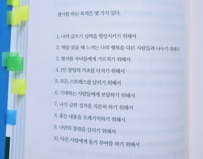 새벽기상 독서, 잠자기전 10분 필사, 필요한 부분만 먼저 읽고 필사, 좋아하는 장르의 책부터 필사해도 좋다는 내용 등 필사의 여러 방법들도 눈에 띈다. 필사에도 데드라인이 필요하다는 저자의 얘기에 올바른 습관은 결국 시간관리를 잘하는 것과 연관된 것이 아닐까 하는 생각도 든다.