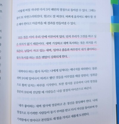 책을 읽다 보면 필사를 통해 많은 힘을 얻고 행복한 독서를 하고 있는 저자의 강인한 에너지가 전해진다. 하루하루 꾸준한 새벽독서, 원고쓰기, 직장생활, 가정생활 등 삶을 주도적으로 이끌어나가는 저자의 모습을 통해 진정 내가 좋아하고 집중하고 싶은 것은 과연 무엇인지 고민하고 생각해 볼 수 있는 계기가 된 것 같다.
