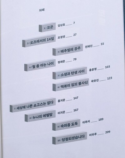 <당첨되셨습니다>는 10명의 작가들 각각의 독특한 시선으로 풀어낸 다양하고 기발한 이야기들을 책 한 권에 모아 놓은, 종합선물세트 같은 느낌의 책이라는 생각이 든다.