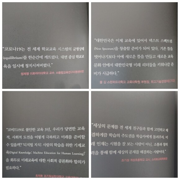 코로나 19로 앞당겨진 디지털 대전환의 시대에 미래교육을 준비하기 위해 저자 네 사람이 모여 미래교육과 인공지능을 비롯한 테크놀로지,그리고 시대를 막론하고 모든 교육의 중심 화두 "우리가 왜교육을 하는지(Why edecation?)"에 대해 수차례에 걸쳐 온라인상에서 만나 원격 대답을 하였다고 한다
