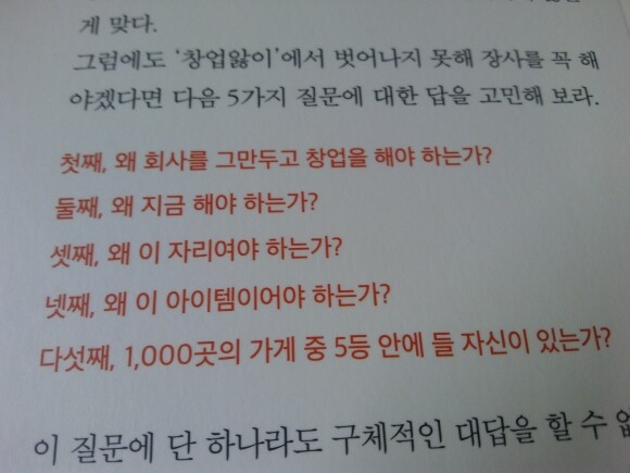 그동안 많은 책은 창업하라고 했지만 이 책은 상위권 성적에 들 자신 없으면 일찌감치 대학진학을 포기하고 다른 길을 찾아야 하듯 1,000곳의 가게 중 5등 안에 들 자신이 없으면 장사를 시작하지 않는게 맞다는 이 글을 통해 많은 이들이 정확한 눈을 가졌으면 하는 바이다
