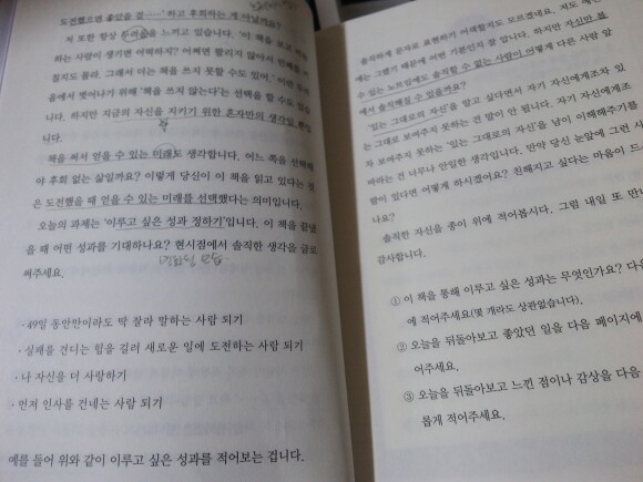 현재 이 책은 나의 모든것을 꺼집어 낼 시간이기에 이렇게 물음에 대답도 혼자서 하고 자신만 볼 수 있는 노트임에도 솔직할 수 없는 내가 안 되고 싶어 현재 물음에 충실한 대답과 49일후에 변화된 나의 모습을 기대하고 나의 있는 그대로의 자신을 알고자 할 때 인 것 같다