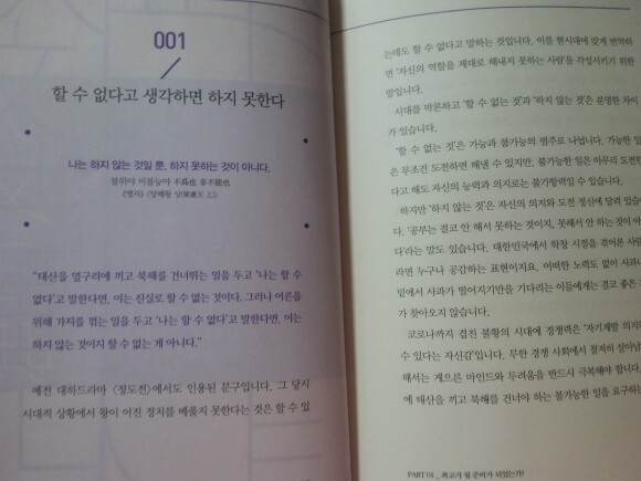 할 수 없는 것은 가능과 불가능의 범주로 나뉘고 가능한 일은 무조건 도전하면 해낼 수 있지만 불가능한 일은 아무리 도전한다고 해도 자신의 능력과 의지로는 불가항력일 수 있다는 글을 읽으면서 현재 내가 도전한 일이 과연 할 수 있는 일인지 아니면 너무 불가항력적인 것인지를 다시 생각하게 된다