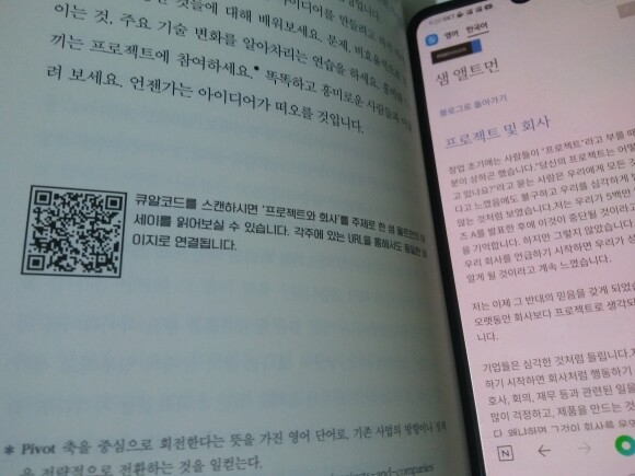 QR코드를 스캔하면 "프로젝트와 회사"를 주제로 한 샘 울트먼의 에세이를 읽어볼 수가 있다. 창업초기에는 사람들이 "프로젝트"라고 부를 때 약간 기분이 상하곤 했다고 한다. "당신의 프로젝트는 어떻게 진행되고 있나요?"라고 묻는 사람은 우리에게 모든 것이 심각하다고 느꼈음에도 불구하고 우리를 심각하게 받아들이지 않는 것처럼 보였다고 한다.