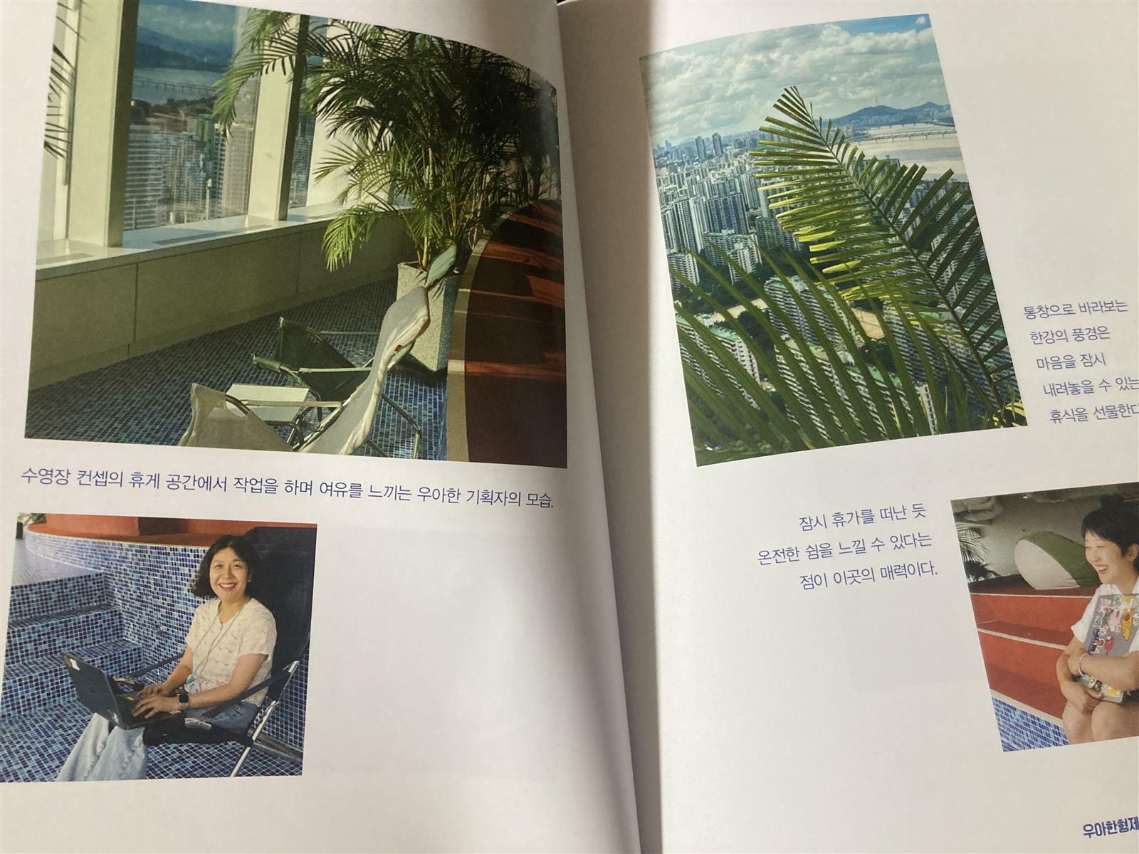 수영장 컨셉의 휴게 공간에서 작업을 하며 여유를 느끼는 우아한 기획자의 모습이 색다른 창의성이 느껴지는 듯 하다. 통창으로 한강의 풍경을 보면서 잠시 휴가를 떠난듯한 기분, 이런 통창을 좋아하는 한사람으로써 이런 곳에서 일을 하면 엄청 효율성이 좋을 것 같은 기분이 든다.
