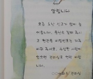 어느날 고모가 사는 아파트에 도난 신고가 많이 접수되니 문단속을 잘 하라는 알림글이 붙었습니다.