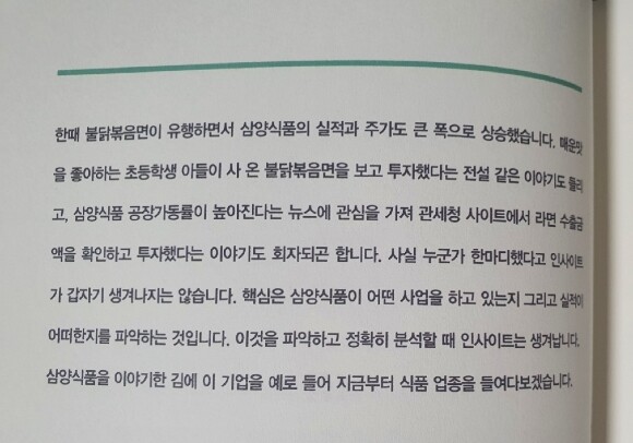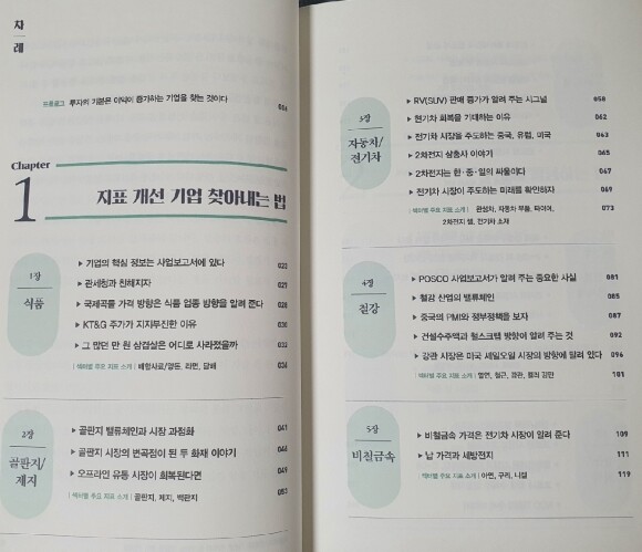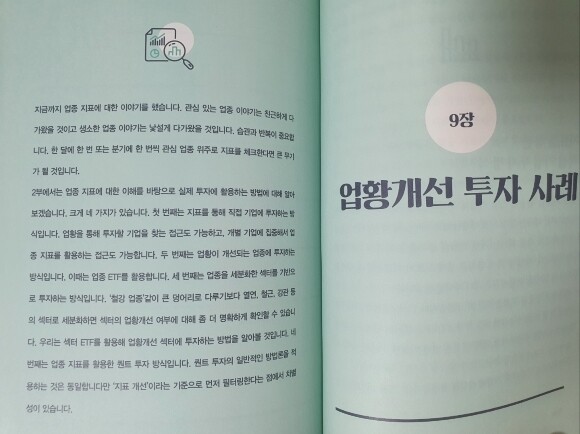 주식을 투자하는 스타일을 크게 지수 투자, 업종 투자, 종목 투자로 나눈다면 이 책은 종목과 업종 투자에 필요한 내용이 담겨 있는 책인 것 같다. 내가 한 회사의 성장성을 염두해두고 투자를 한다고 해도, 그 회사 역시 회사가 속한 업종의 흐름을 크게 벗어나지 못한다.