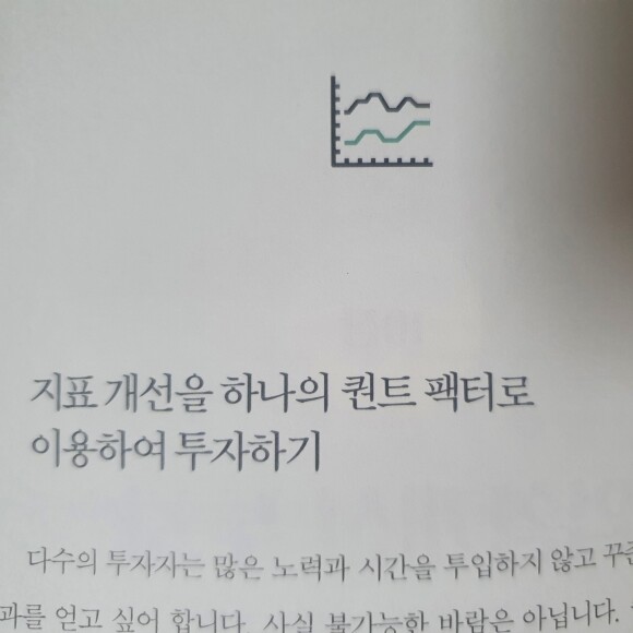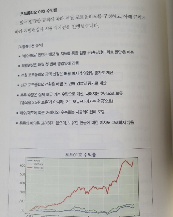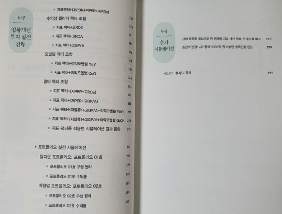 후반부에는 앞서 소개한 지표들을 활용하여 뇌동매매를 방지하도록 퀀트의 요소로 활용하는 전략이 나온다. 실제 포트폴리오를 구성하는 하나의 시뮬레이션 기준을 세워 백테스트를 해보는 예시들을 소개하기 때문에 상당히 실질적이라고 느껴지기도 했다. 지표의 개선이 하나의 전환 기준이 되고, 그것을 어떻게 활용하는지를 함께 연구해볼 수 있는 페이지를 구성해주셔서 도움을 많이 받았다.