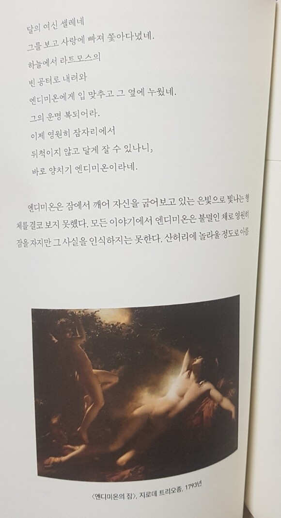 개인적으로 읽으면서 흥미로웠던 점은, 내가 어렴풋이 알고 있던 이야기가 구체화 될 때나, 원전에서 만난 인물들이 이후 여러 작품들 속에서 재가공되어 내가 먼저 만난 상태일 때의 만가움이었다. 엔디미온 같은 경우 어렸을 적에 세일러문이라는 만화에서 세레니티(세일러문)을 사랑한 지구의 왕자로 묘사가 되어 소개되었는데, 세일러문 작품 자체가 각 행성(=행성의 이름이 그리스로마신화의 신들이기에, 그 신들의 힘을 모티브한 세일러 전사가 나온다) 이다보니 이런 그리스로마신화적 소재가 많이 활용되었다고 생각하긴 했지만 막상 이야기 속에서 나오는 그 장면장면들을 접하고, 이것을 이후의 작가들이 어떠한 상상력을 풀어 새로이 계승했는지를 느낄 수 있다는 점이 특히 더 매력적이었다. 원재료가 워낙 훌륭하니 요리할 거리가 많달까. 예전에 차이나는 클라스에서 다양한 신화나 민화 같은 전승되어 있는 글들이 이후 어떻게 새롭게 계승되어 현재까지 활용되고 있는지에 관한 내용을 들은 저깅 있었는데, 그때의 감동을 이 작품 속에서 한껏 더 느낄 수 있어 더 재미있다는 생각이 들었다. 원전의 매력에 푹 빠지고 싶다면 이 책만한 그리스 로마 신화가 없을 것이다.