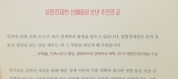 책을 펼쳤을 때 가장 인상깊었던 부분은 저자인 김나영 선생님의 제자들이 선생님과의 실험경제반 수업을 통해 멋지게 자라서 자신의 진로와 적성을 찾아가는 장면이다. 이 장면이 마지막에 있엇다면 이 결과 그렇게 자랐구나 하는 기승전결 후의 에필로그 느낌이 났을 것 같은데 이 내용을 책 앞쪽 간지에 전면 배치해서 이렇게 아이들이 자라려면 어떤 경제 수업을 받은 것인가?라며 기대하게 만든다. 나 또한 이 부분이 너무나 기대되어 더욱 몰입하여 읽게 된 것 같다.
