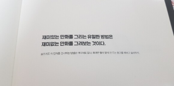 책은 2쪽에 한가지 생각들을 풀어놓았다. 왼 편에는 생각을 이미지화한 간단한 그림이, 오른편에는 자신의 생각 한가지와 그에 대한 설명이 들어있다. 읽으면서 느낀 건 도망가지 말라, 해봐라와 같은 마음가짐에 대한 부분과 실제 그림을 그릴 때 도움이 될만한 부분, 연재를 할 때의 고민점들에 대한 자신의 생각들을 함께 풀어놔줘서 너무 마인드셋으로 가지도, 너무 기술적으로 가지도 않은 적절한 균형을 잡는 기분이 든다.