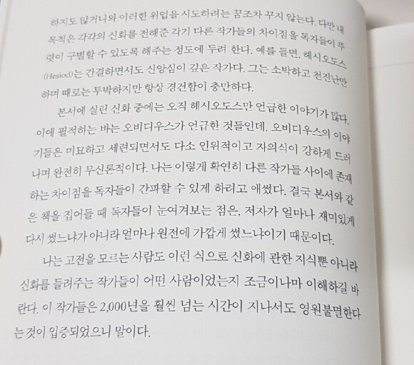 다른 작가들과 달리 이 이야기를 하나로 통합하지 않겠다는 점. 그 근거로 드는 부분이 위대한 작가들의 글을 '리어왕'과 같은 글을 내가 각색함으로 인해 '신데렐라'와 같은 글처럼 수준이 낮아질 것을 두려워하는 겸손한 작가의 태도와 그만큼 위대함을 살리고자 원전의 매력을 그대로 소개하기 위해 노력한 작가의 모습이 꽤나 감동적이었다. 간결하면서도 신앙심이 깊은 헤시오도스와 세련되면서도 자의식이 강하고 무신론적인 성향이 드러나는 오비디우스의 원전을 독자가  구분하며 읽으며 자신처럼 원전의 매력을 각각 느낄 수 있었으면 좋겠다고 소개하는 점 또한 이러한 작가의 겸손함과 작품에 대한 사랑, 또 위대한 작품을 만나게끔 이끌어주려는 배려가 하나하나 느껴져 더욱 마음이 갔다.