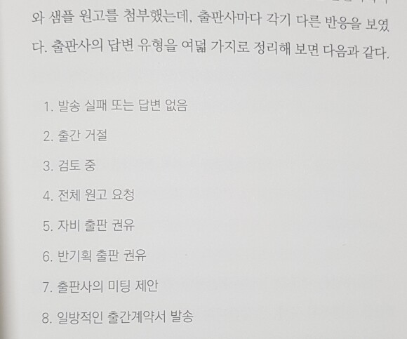샘플 원고를 투고하는 장면이 아주 인상깊었다. 주변에 출판 투고를 하는 사람들에게 들었던 이야기와 겹치기도 하고, 이렇게 다양한 방법으로 피드백이 오는구나 싶어 마음의 준비를 할 수 있을 것 같기 때문이기도 하다. 뒤로 갈수록 호의적인 반응일텐데, 막상 이런 과정들을 겪으며 내 마음속 밀당이 얼마나 일어날지 작가님의 글과 함께 경험하는 것이 언젠가 내가 경험하고 싶은 심리적 고민이 아닐까 하는 생각이 들었다.