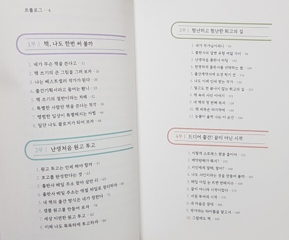 책을 보며 가장 마음에 들었던 것은 이 책의 구성이 자신이 경험한 책쓰기의 길을 한 걸음 한 걸음 따라가도록 구성했다는 점이다. 전문가라기보단 얼마 전 경험한 한걸음 앞 선배가 나는 이런 이런 걸 경험했다며 썰을 풀어주는 듯한 가벼운 책. 하지만 가벼운 느낌 속에서도 내용은 꽉 찬 책이라 더 마음에 들었다.