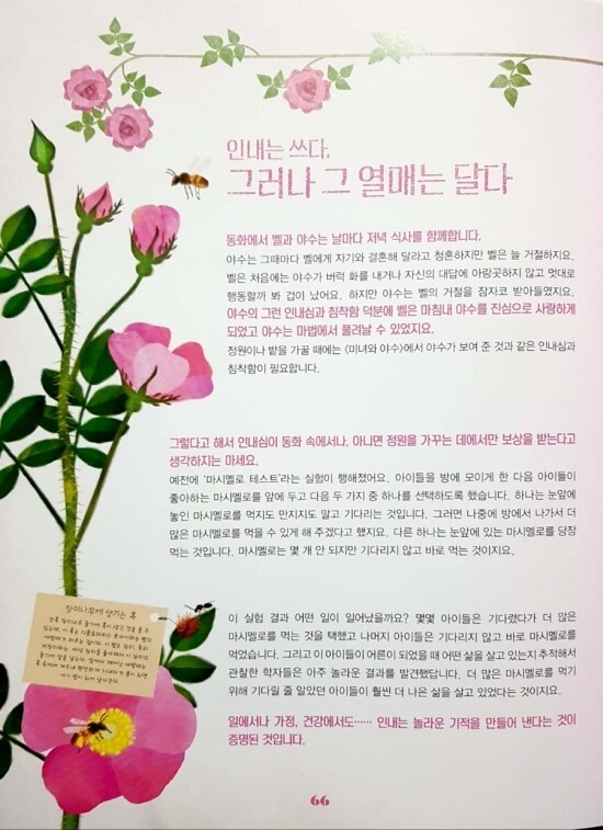 배운 점/장미의 매력은 끝이 없지!_꽃이 활짝 핀 정원을 거닐거나 꽃집에 가면 아름다운 꽃들을 많이 볼 수 있지요. 하지만 지난 수천 년 동안 유럽에서 가장 아름다운 꽃은 장미였답니다. 이렇게 말할 수 있는 것은 꽃의 모양이나 색깔뿐 아니라 향기와 또 다른 수많은 효능 때문이지요.(64) / 저도 가장 아름다운 꽃은 장미에요. 장미 향수, 로즈 오일 등 향기가 좋아요. 매력적인 장미처럼 향기나는 사람이 되고 싶어요.
