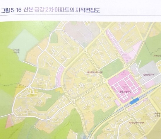 그림 5-16에서 보시다시피 산본신도시 내 아파트는 지적편집도상 노란색인 2종 주거지 혹은 3종 주거지역이다. 이곳의 용적률은 불과 217%이다. 2종 내지 3종 주거지역이었다면 사실상 재건축이 힘든 수준이다. 그러나 이곳의 용도지역은 상업지임을 명심해야 한다. 상업지역의 용적률은 600% 수준이기 때문에 사실 이 아파트는 사업성이 매우 좋은 아파트라고 봐야 한다. 그러나 가격은 이런 현실을 반영하지 않고 있다.