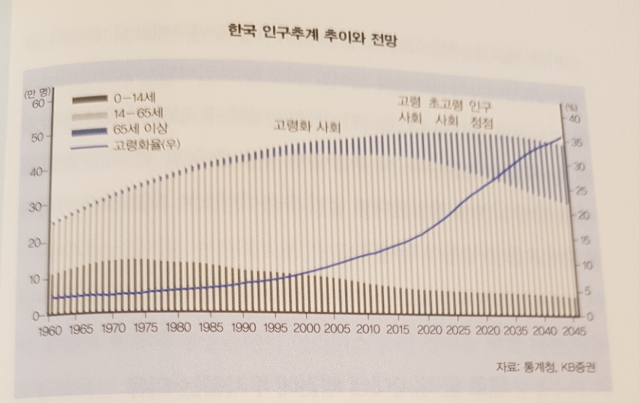 한국 정부는 5년마다 시행하는 인구주택총조사를 기초로 10년 후 5,290만 명을 정점으로 2029년부터 인구가 감소한다고 공식 추정하고 있습니다. 이러한 고령화율과 인구 감소는 한국의 잠재성장률을 떨어뜨릴 수밖에 없습니다. 그리고 잠재성장률 하락은 금리를 저하하는 방향으로 움직이게 만듭니다.(215~220쪽) 고령화 속도가 빠른 이유가 출산율이 낮은 반면에 기대수명이 늘어나서 초고령사회로 진입한다고 하네요.