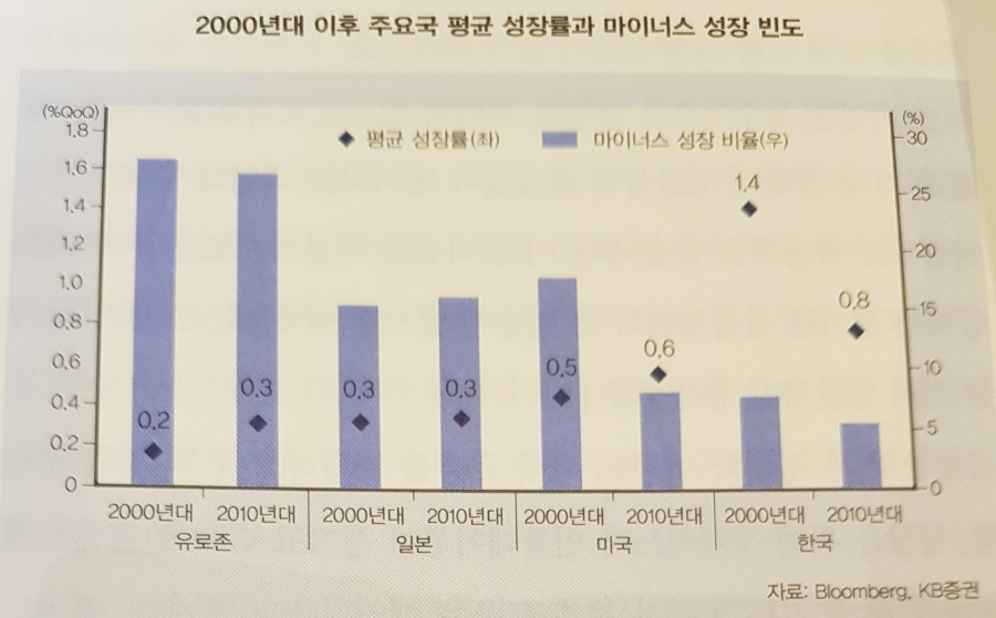 제로 금리 시대에 채권에 투자하는 이유_금리가 마이너스로 내려가도 국민 각각의 삶이 나빠질 거라고 생각하지 않습니다. 2000년대 이후 중요국 평균 성장률과 마이너스 성장의 빈도를 보여줍니다.(220~223쪽) 미래 세대에는 GDP가 마냥 올라가는 게 아니라 1년에 1분기 정도는 GDP가 역성장하는 것이 당연해질 거라고 하네요.