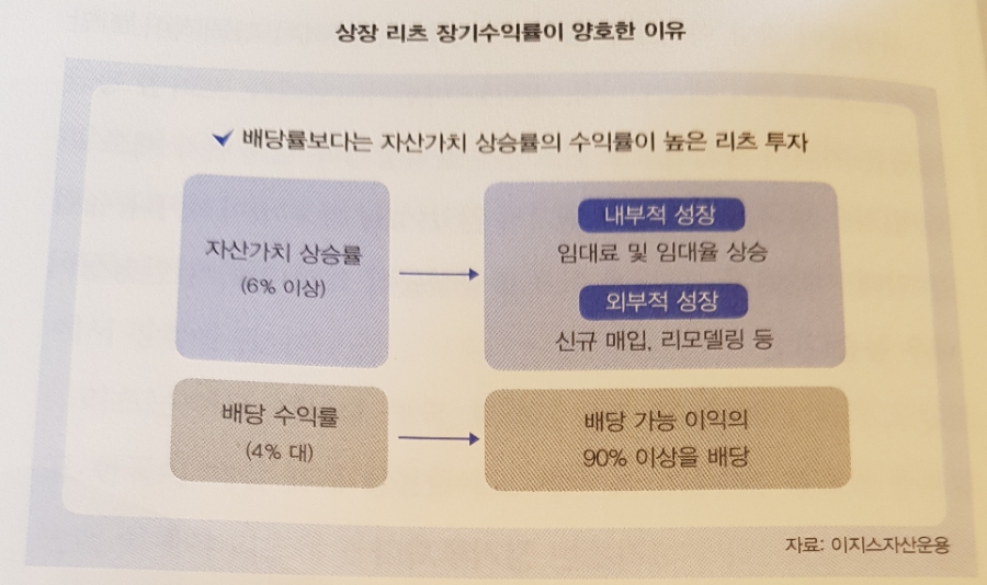 리츠는 장기투자다_단기투자가 아니라 장기투자로 볼 경우 더 상승할 것입니다. 상장 리츠는 장기수익률이 연평균 10퍼센트로 상당히 양호합니다. 리츠에는 '외부적 성장'이라는 것이 있습니다. 그들은 투자자의 자금으로 계속 빌딩을 사고파는 데 쌀 때 사고 비쌀 때 팝니다. 여기에다 지속적인 임대료 상승을 위해 꾸준히 좋은 임차인으로 바꾸려 노력합니다.(151~153쪽) '외부적 성장'이 정말 중요하네요.