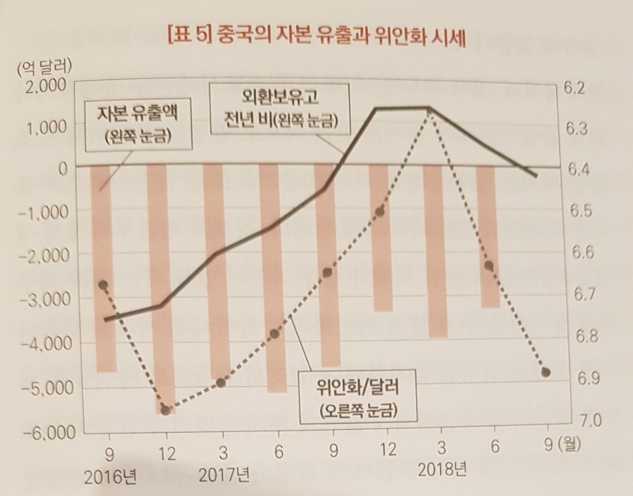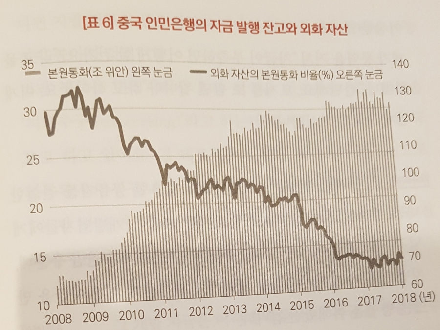 [표 5]를 보면 외환보유고가 감소하는 것과 동시에 위안화 시세가 하락하는 것을 알 수 있습니다. 이는 필연적인 결과이기도 해요. 즉 달러와 확실히 연결시켜 고정시키면 달러가 일정하게 들어옵니다. 그러나 달러가 들어오지 않았는데 위안화를  발행하기 때문에 달러에 비해 위안화가 초과되는 것입니다.(94~95쪽)
