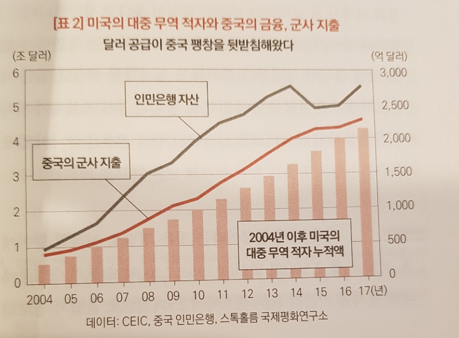 배운 점/TAMURA_안전보장 면에서는 남중국해 등에 관해 오바마 정권 때와 달리 '항행의 자유' 작전도 꽤 과감하게 실시하는 등 완강하고 강경한 태세를 유지하고 있습니다. 제가 봤을 때 트럼프 정권은 미국이 대중 무역 적자 2,000억 달러(약 237조 6,000억 원)를 줄이는 것이 얼마나 중요한지 확실히 인식하고 있어요. [표 2]를 봐도 알 수 있듯이 이 대중 무역 적자야말로 중국이 제멋대로 설치게 하는 요인이 되었죠. 트럼프가 이를 저지하기 위한 전략을 고수하느냐 마느냐가 매우 중요한 문제라는 뜻입니다.(41쪽) 무역 중심의 전쟁은 끝나지 않을 거예요.