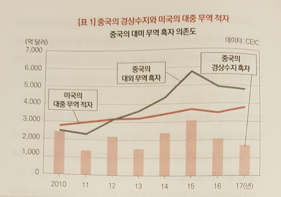 MIYAZAKI_미ㆍ중 간에 무역 긴장감이 고조되자 중국 기업들이 막판 밀어내기 수출을 한 덕에 2018년 3분기, 4분기에 중국은 오히려 무역 흑자를 기록했어요. 하지만 이는 일시적인 현상입니다. 미국의 대중 무역 적자가 중국의 번영을 지원한다는 것([표 1] 참조)은 이미 지난 얘기입니다.(35~36쪽)