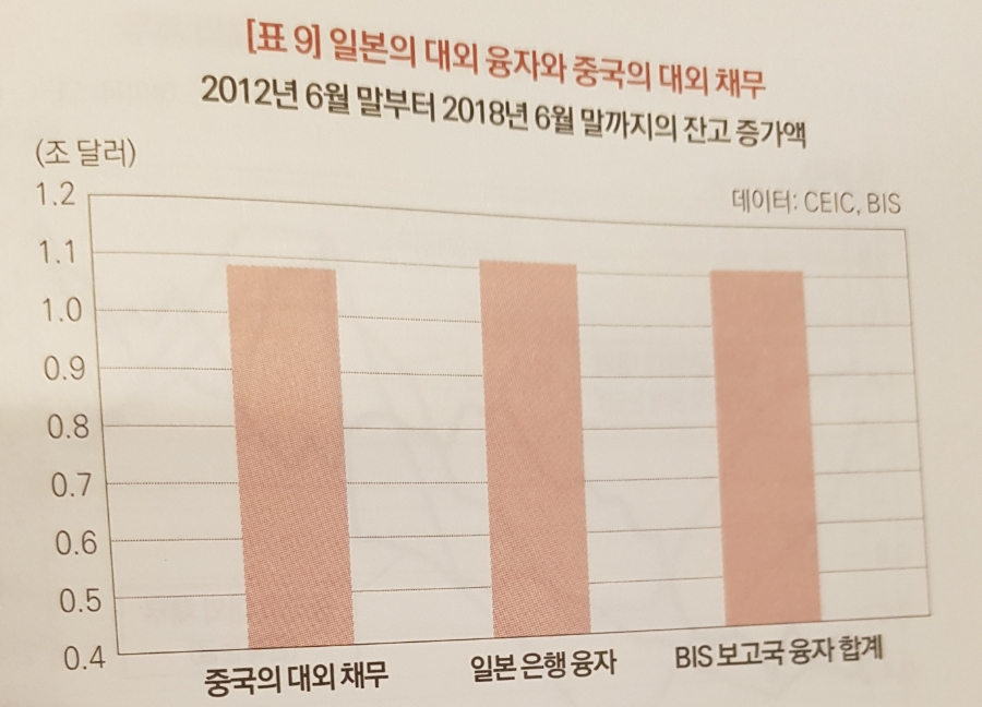 MIYAZAKI_달러와 연결되지 않는 위안화가 이른바 '완화 머니' 형태로 발행되는 거군요. 그것과는 별개로 일본은행은 '이차원 완화'로 불리는 양적ㆍ질적완화를 단행하며 '베이스 머니'를 확대시켰습니다. 이 중 1조 달러(약 1,100조 원)가 넘는 자금이 해외로 나가고 있습니다. 일본 은행이 대출을 해주고 있는 겁니다. 결과적으로 이 대출금의 대부분은 중국이 빌려간 형태로 되어 있는데, 이게 맹점입니다. [표 9]를 보면 2012년 6월 말부터 2018년 6월 말까지 6년 동안 일본 은행은 국제금융시장에 1조 1,000억 달러(약 1,200조원) 이상을 빌려줬습니다. 6년 동안 증가한 금액을 보면 일본이 100퍼센트 빌려준 게 됩니다. 돈을 빌린 나라른 중국이 단연 선두에 있습니다. 그래서 중국은 해외로부터 저금리의 유리한 조건으로 돈을 빌릴 수 있게 되었습니다.(215~217쪽)