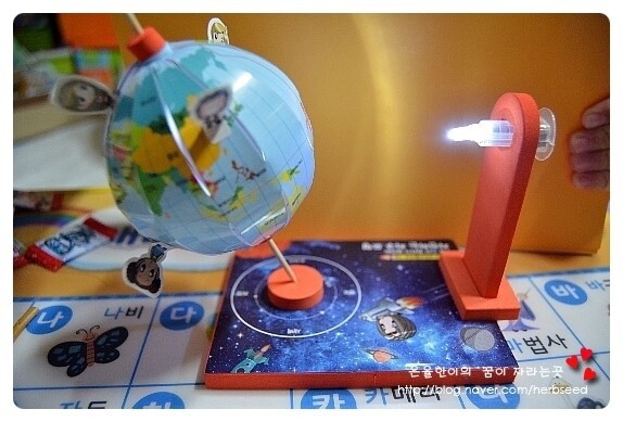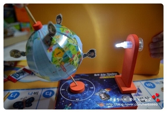 아이들 말을 듣고 방안의 불을 끄고 램프 불을 켠 후 지구본을 뱅글뱅글 돌려봤더니 정말 낮과 밤인 곳이 확실히 구별되네요^^
