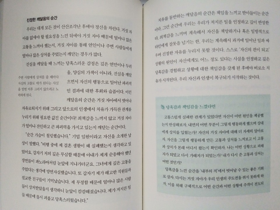 치유를 동반하는 깨달음의 순간은 책임을 느끼고 받아들이는 순간이다. 우리는 우리가 저지른 일을 인정하고 깊이 반성한다. 죄책감을 느끼며 계속해서 자신을 책망하거나 혹은 일방적으로 타인에게 잘못을 넘기는 한, 우리는 계속해서 과거에 일어난 일과 싸우며 진정한 자유를 느끼지 못할 것이다. 스스로 '자신의 편이 되고' 상황의 원인이 자신에게도 어느 정도 있다는 사실을 인정하고 싶은 당혹감을 경험하고 상황에 대한 책임감을 갖게 된 후에야 비로소 치유가 시작된다. 우리 자신과 인생이 복구되기 시작하는 것이다. -205p
