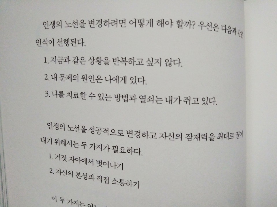 진정한 인생의 노선 변경은 내가 변하는 과정이다. 자의식이 변하고, 진짜 나의 모습을 깨닫게 되며 나를 가두는 거짓 자아 또는 에고로 부터 해방된다. -107p