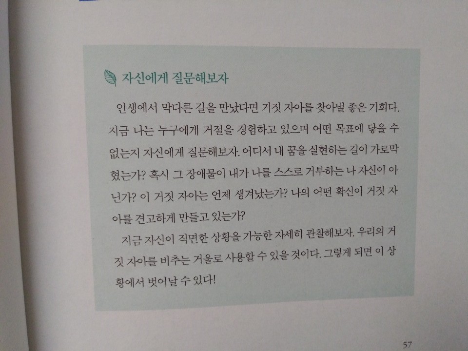 이런 질문들을 던지고 답을 찾아서 조금씩 전진하다 보면 거짓자아가 만든 감옥에서 나갈 기회를 얻게 되고, 실제 현실을 보게 될 것이다. 진짜 세계와 우리 자신을 말이다. -57p