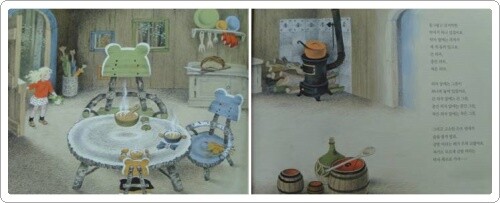열려 있는 문 안으로 들어가 보니 탁자 옆에 의자도 세 개, 수프가 담겨 있는 그릇도 세 개가 있지 뭐예요.