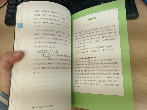 대부분의 심판은 보수가 많지 않아서 다들 본업이 따로 있다고 한다. 저자 역시 환경 공무원으로 근무하면서 퀵 배달도 하고 축구 심판도 한다. 학창 시절 축구 선수가 되기 위해 운동만 했던 저자는 부모님의 이혼, 진학하기로 했던 대학 감독이 비리로 구속되면서 축구부 해체 등의 좌절을 겪으면서 꿈을 접게 되고 당장의 생계를 걱정해야 하는 상황까지 겪게 된다. 어려서부터 운동을 성실히 한 체력, 정신, 마음가짐 덕분일까? 누가 봐도 희망이 보이지 않을 절망적인 상황에서 저자는 끝까지, 성실하고 치열하게 삶을 꾸려 나간다. 악착같은 노력으로 체대 합격 후 사회 복지 일을 하면서 여러 직업을 병행하는 고단한 삶 속에서도 축구에 대한 열망을 놓지 않고 K 리그 심판을 목표로 체력 단련을 하고 경험을 쌓으면서 결국 K 리그 심판은 물론 현재 많은 사람들에게 꿈과 희망을 주는 동기 부여 강사로도 활발히 활동하게 된다.