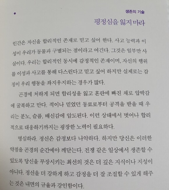 또한 ‘그래도 아직은 살만한 세상이고 돕고 사는 세상’이라는 평화, 협동이라는 낭만적 이상을 버려야 한다고 말하는데 인간은 이기적이며 결핍과 불안으로 하여금 자신의 이익을 위해 움직이므로 인간들의 나약함을 인정하고 보이지 않는 칼날에 대비할 수 있도록 준비해야 지속적인 강자의 자리에서 경쟁에 대비할 수 있도록 조언한다.