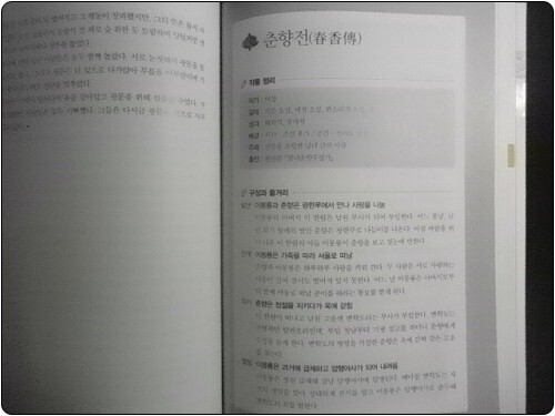 아이들 용으로 나온 고전소설들은 모두 평이하게 바꾸어 놓은 글들이 대부분이었는데, 역시나 중고등학생들의 수능, 논술 대비용이라 그런지 전문이 그대로 실려있다. 이렇게 만나니 꽤나 어렵다. 내가 이렇게 모르는 단어가 많았구나를 깨닫기도 하고, 우리 아이들이 공부하는 것이 정말 상상을 초월할 정도로 많구나 싶기다 하다.  작년에 책을 구입하고 시간 날때마다 조금씩 읽어나가는데, 의무감이 없이 재미로 읽어나가는 난 행복하지만, 엄마의 억지로 읽으려고 하는 딸아이는 죽을 맛인지, 여직 고전은 손도 안되고 있다.  내가 좋다고 아이가 좋은건 아닌데, 이책의 좋은점이 내 눈에 팍팍 들어오니 어쩌겠는가?