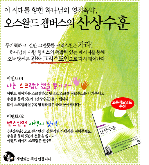 이벤트 기간 : 2009.2.9(월)~2009.2.22(일) 당첨자 발표 : 2009.2.23(월) 토기장이카페 위 이벤트는 중복참여가 가능합니다. 스크랩 하실때는 꼭, 전체공개 체크해주시는 센스!!! 많이많이 참여해주세요~~ 단 댓글 다실때 반드시 [이벤트 01] 또는 [이벤트 02]라고 덧붙여주세요.