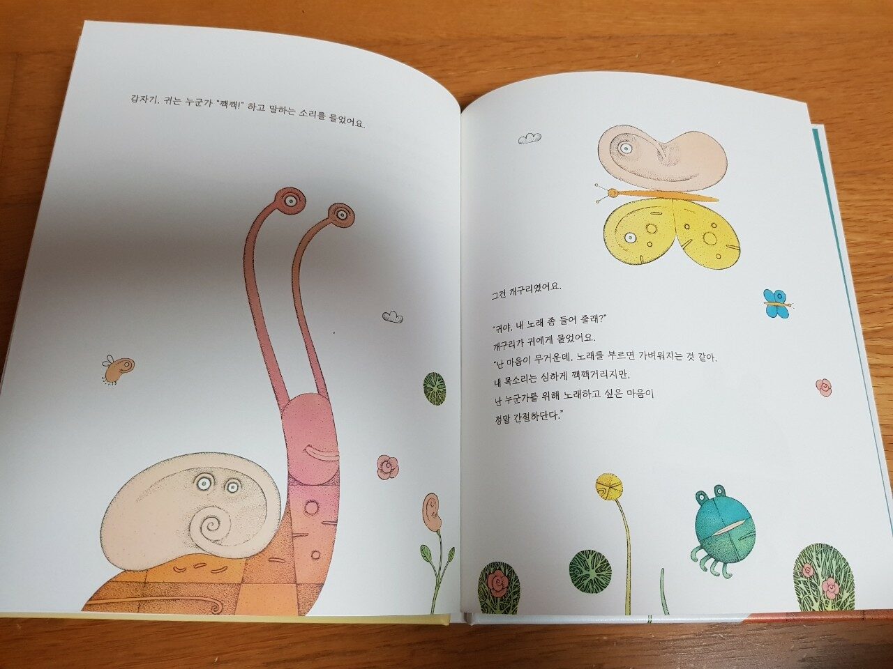 그런데 개구리가 내 노래 좀 들어달라고 부탁하게 되고 귀는 개구리의 노래를 잘 들어줍니다.