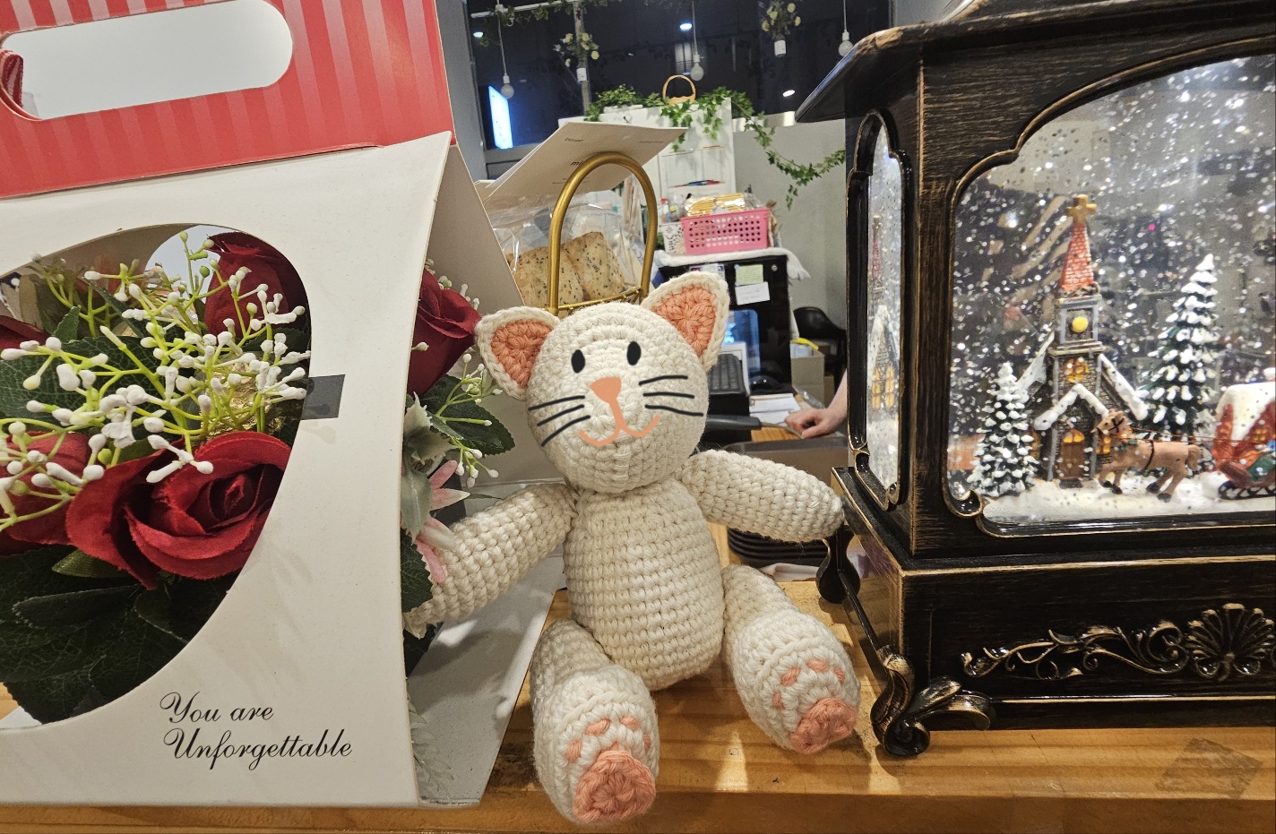 사슬뜨기로 만든 리본으로 사랑스러움을 더해주네요.