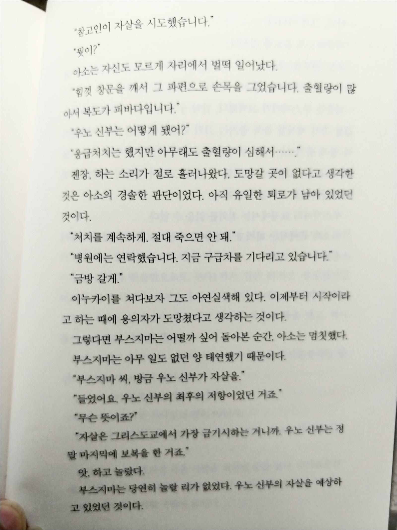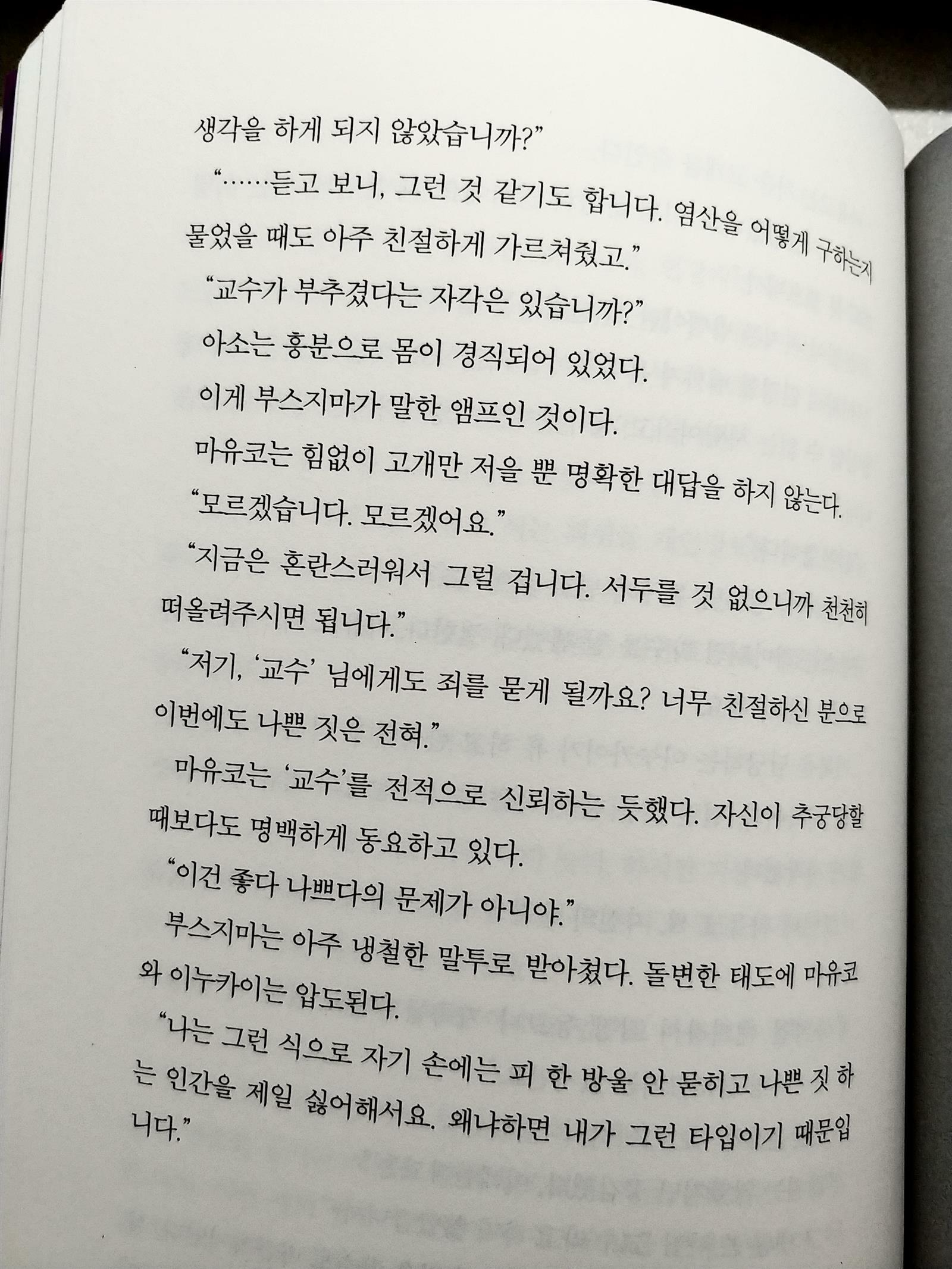 이 작품에서 유경위는 사건을 해결하면서 법정이 아닌 검찰청 취조실에서 사건의 전모를 알려준다. 읽는 독자에게 지금부터 내가 하는 것을 잘보라고 말하는 것 같다. 범인들과의 질문과 대답을 통해, 각종 증거를 제시하며 그들의 부인과 묵묵부답에 대응하면서... 그런데 뭔가 조금 아쉽다.