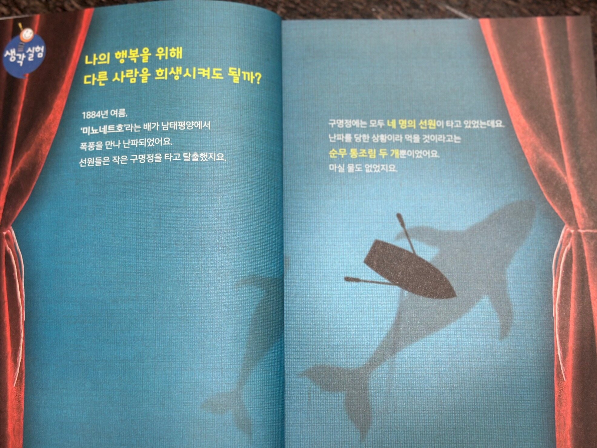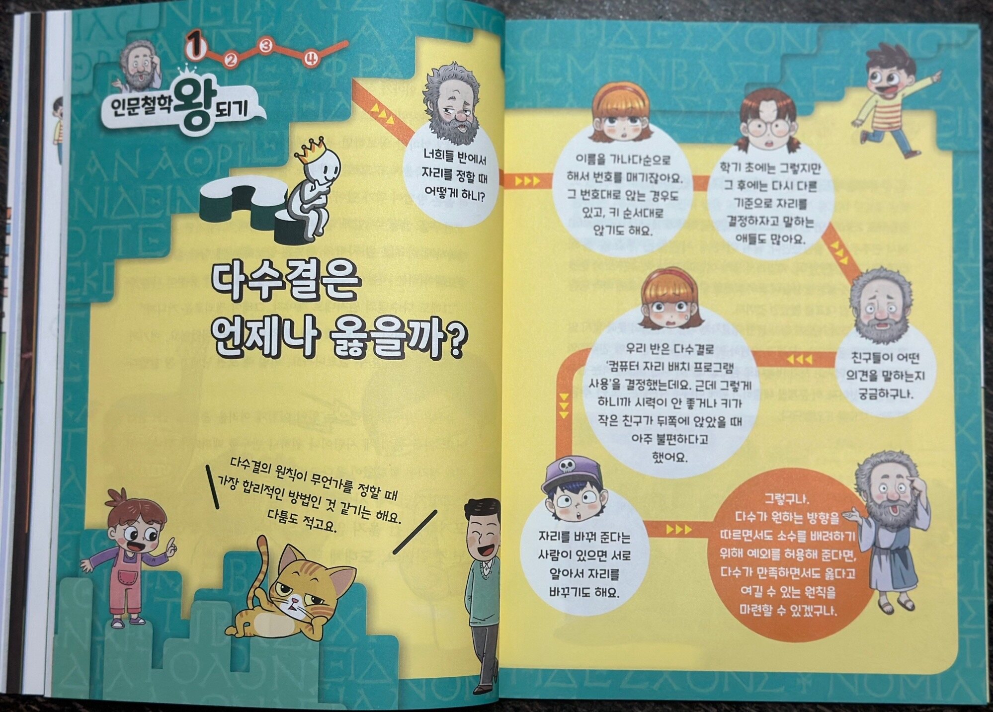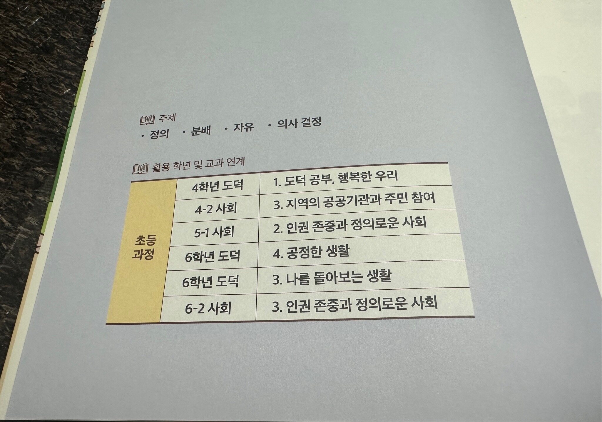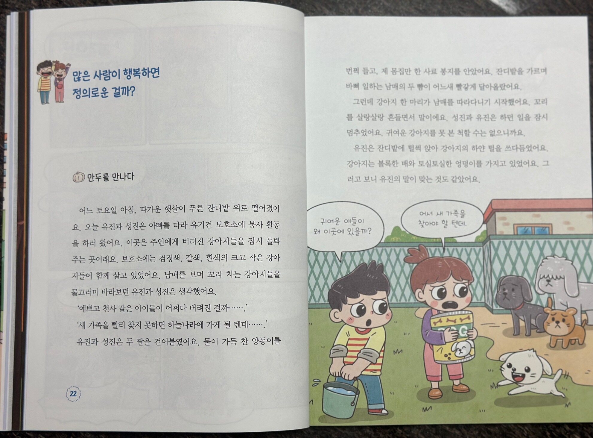 그림책을 사랑하던 아이와 이제는 글밥이 많은 책으로 넘어가야 할 시기가 되었다. 문학 도서는 그래도 수월하게, 이야기 읽듯 조금씩 글밥을 늘리고 있는데 비문학 도서는 어렵게 느껴진다. 학습 만화를 많이 읽는 요즘, 초등학생을 위한 인문 철학도서가 나왔다기에 어떤 책일지 정말 궁금했다. 전집 중 읽어보게 된 책은 “정의란 무엇일까?” 였다. 대학원생 시절, 마이클 샌델의 책 ”정의란 무엇인가“를 읽고 저자 강연회에 참석했던 기억이 떠올랐다. 그때도 이해하기 만만치 않은 개념이라고 생각했는데 과연 초등학생들이 읽을 수 있을까하는 의문을 갖고 책을 펼쳤다. 활용학년과 교과연계가 되는 부분도 자세히 소개되어있어 해당 학년의 학생들에게는 이해를 돕고, 저학년 학생들에게는 학교에서 배우기 전에 책으로 접해볼 수 있는 기회가 되겠다. “생각 실험” 파트에서는 정의의 개념을 사례를 들어 상황을 이야기처럼 풀어나가며 그 안에서 생각해 볼 질문을 던진다. 첫 파트에서 다룬 “다수결, 다수의 행복을 위한 희생”에 대한 사례를 읽어 본 아이도 질문을 많이 쏟아냈다. 어려운 개념을 쉽게 풀어나가는 이 책에서 학습 만화 파트도 빠지지 않았다. 대화를 통해서 정의에 조금은 더 쉽게 이해할 수 있게 소개하고 있다. “주제와 관련된 동화” 파트에서는 이야기의 내용을 그린 삽화와 함께 생각 실험에서 던진 질문에 대해 생각해볼 만한 상황을 그려나간다. 반려견을 키울 것인지를 놓고 가족이 토론을 벌이는데 그 과정에서 “다수결”이 항상 정의로운 것인지에 대해 끊임없이 의견을 나눈다. “인문철학 왕 되기“ 파트에서는 앞에서 다룬 생각실험부터 만화, 이야기에서 다룬 다수결에 대해 정리하는 부분이다. 일목요연한 내용과 토론식 글의 진행이 초등학생도 충분히 재미있게 읽어나갈 수 있게 해준다. ...미래사회가 요구하는 인문학적 상상력과 과학기술 창조력을 두루 갖춘 창의 융합형 인재를 양성하는 것을 목표로 합니다. 라는 추천사의 글처럼, 아이들에게 생각의 눈을 열어주고 지식을 다루는 지혜를 갖추는게 도움이 될 수 있는 책이라고 생각한다. 초등첫인문철학왕을 읽으며 끊임없이 질문하고 궁금해하던 아이가 앞으로도 다양한 분야의 책을 읽으며 호기심을 갖고 생각하고 질문하면서 쑥쑥 커나가기를 바란다. **본 서평은 도치맘카페에서 도서를 제공받아 읽은 후 솔직하게 작성하였습니다. **