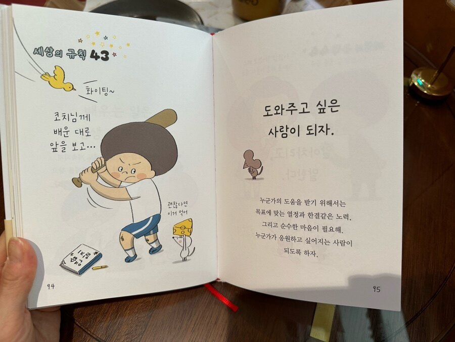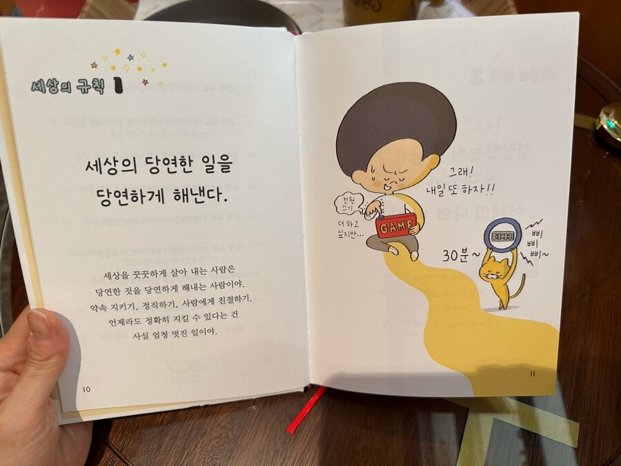 마지막으로 첫번째 규칙을 소개한다. "세상의 당연한 일을 당연하게 해낸다." 선문답같은 이야기 같지만 설명을 읽어보면 고개를 끄덕이게 된다. 세상을 꿋꿋하게 살아 내는 일이 사실 얼마나 어려운 일인가. 배워서 알고 있고 당연히 지켜야 하는 것들을 정확히 지켜낸 다는 것은 정말 멋진 일이라고 생각한다. 이 책을 읽는 나의 소중한 아이도 초등학생때부터 배우는 당연한 일이라는 것을 어른이 되어서도 흔들리지 않고 지켜내는 굳은 심지와 단단한 주관과 행동하는 용기를 갖는 아이로 성장하기를 바란다.