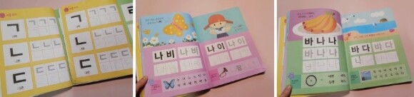 <재미있고 빠른 한글쓰기 1,2>는 자음부터 시작해요. 자음의 획순, 읽는 방법 등이 잘 나와있구요. 그 다음부터는 나비, 바나나, 바다 같은 간단한 단어들이 나온답니다.